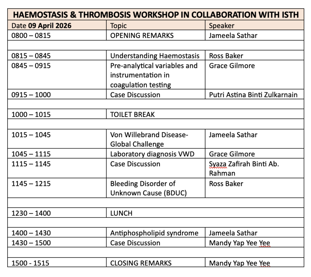 On 9 April 2026, a successful Haemostasis and Thrombosis Workshop was held at Hospital Ampang, Malaysia, in collaboration with Perth Blood Institute and the Malaysian Society of Patient Blood Management.